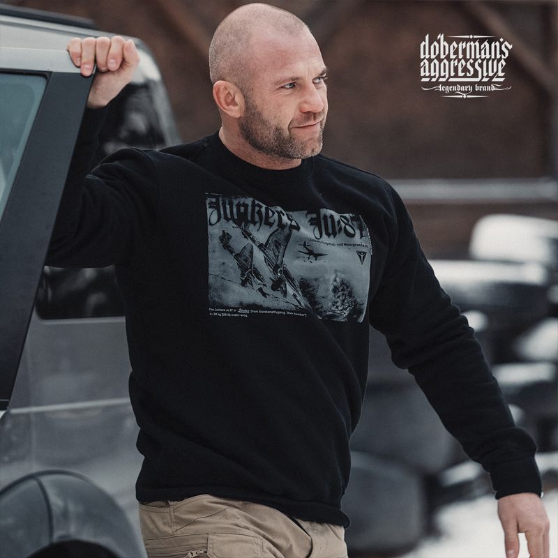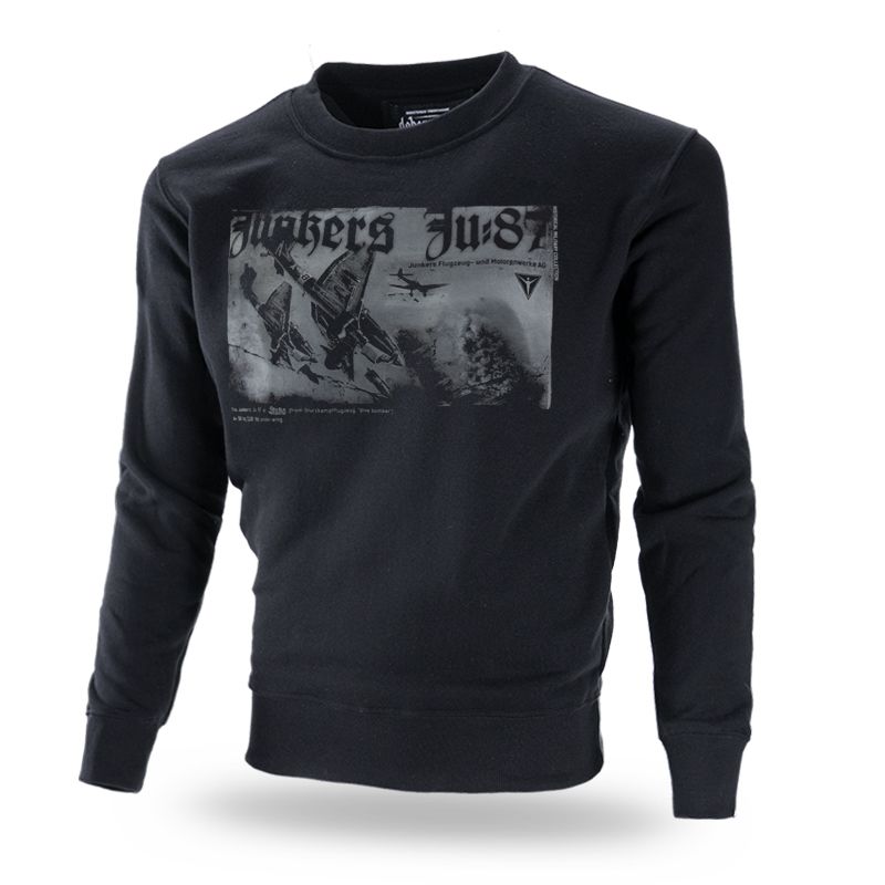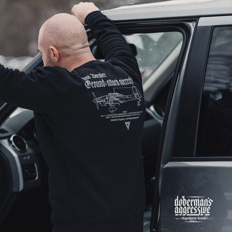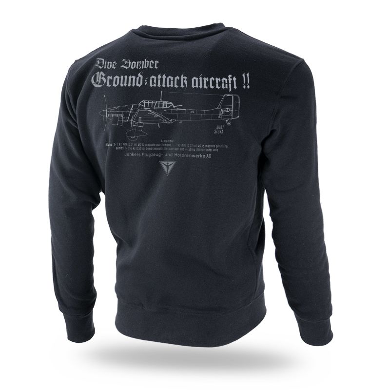 Ein bequemes Sweatshirt aus angenehmer Baumwolle. Auf der Vorderseite sind Kampfflugzeuge Ju87 aus dem 2. Weltkrieg abgebildet. Auf der Rückseite befindet sich eine Zeichnung des Flugzeugs mit Bewaffnungsübersicht.