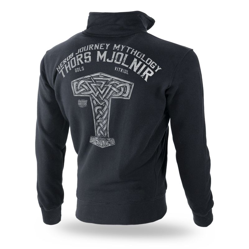 Klassische Sweatjacke aus hochwertiger Baumwolle mit Reißverschluss und Stehkragen, versehen mit elastischen Bündchen und zwei Fronttaschen. Auf dem Rücken befindet sich ein Motiv mit Thor´s Hammer und der Aufschrift HEROS JOURNEY MYTHOLOGY THORS MJOLNIR sowie das Doberman’s Aggressive Logo. Auf der Vorderseite im Brustbereich links ist eine Miniatur-Darstellung von Thor´s Hammer abgebildet.