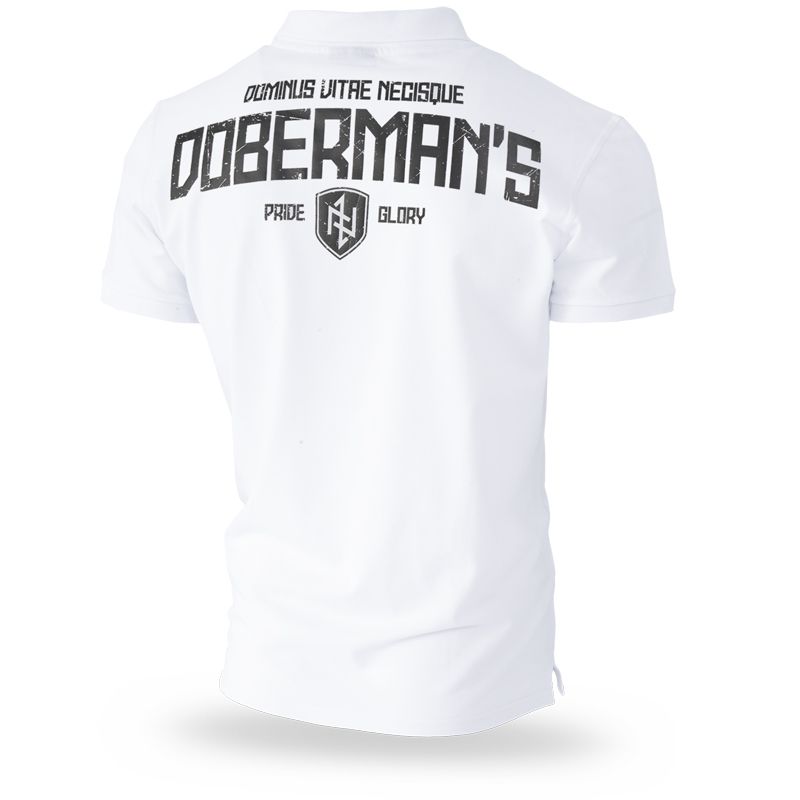 Herren-Poloshirt aus hochwertiger Baumwolle mit kurzen Ärmeln. Während die Vorderseite einen kleinen Aufdruck auf der Brust hat, ist auf der Rückseite dagegen ein großer Dominus Vitae Necisque DOBERMANN-Aufdruck komplett mit einem Schild mit Runen und der Verbindung Pride - Glory.