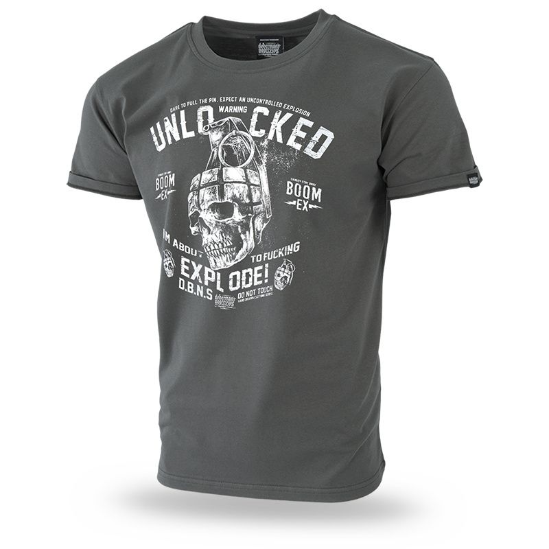 Klassisches Herren-T-Shirt aus hochwertiger Baumwolle mit kurzen Ärmeln.Auf dem linken Ärmel befindet sich ein kleiner Patch mit dem Doberman´s Aggressive-Logo. Auf der Vorder- und Rückseite befindet sich der Print "Unlocked explode!".