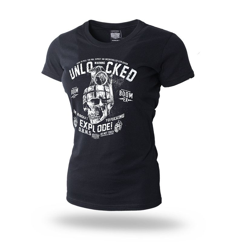 Damenshirt in körpernaher Passform. Auf dem linken Ärmel befindet sich ein kleiner Patch mit dem Doberman´s Aggressive-Logo. Auf der Vorder- und Rückseite befindet sich der Print "Unlocked explode!".