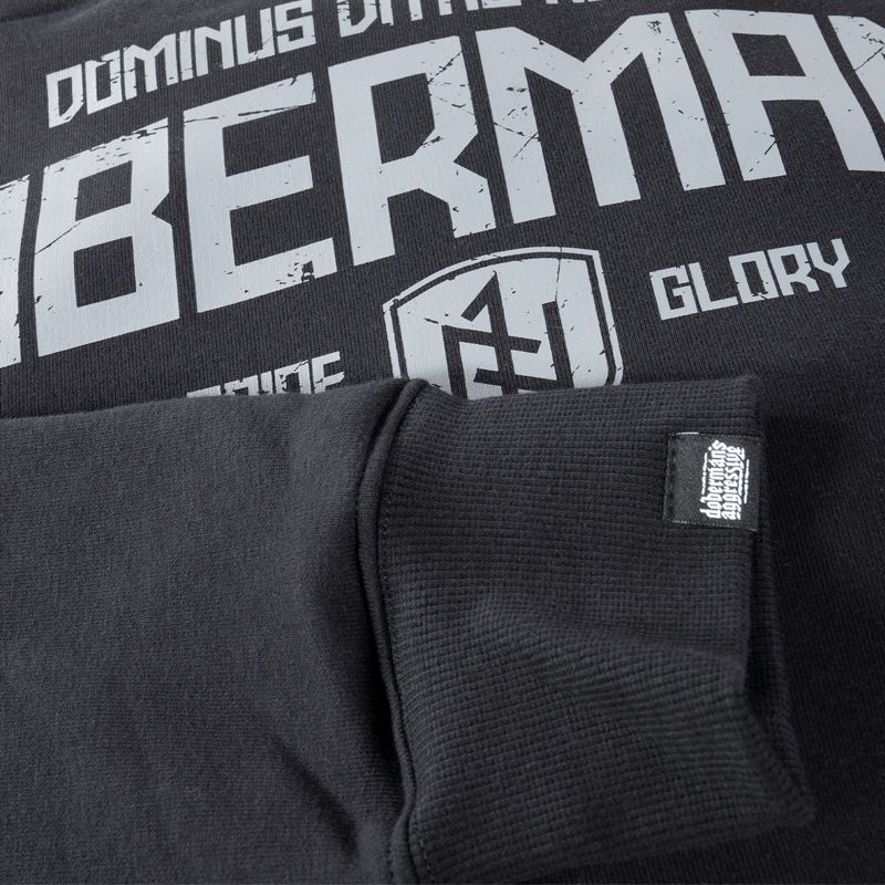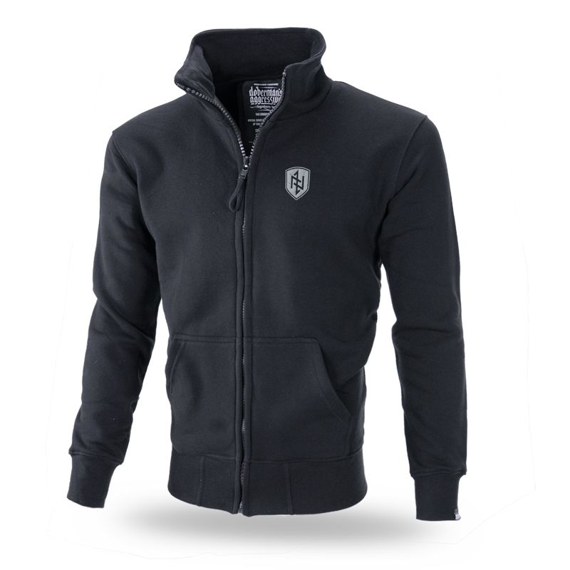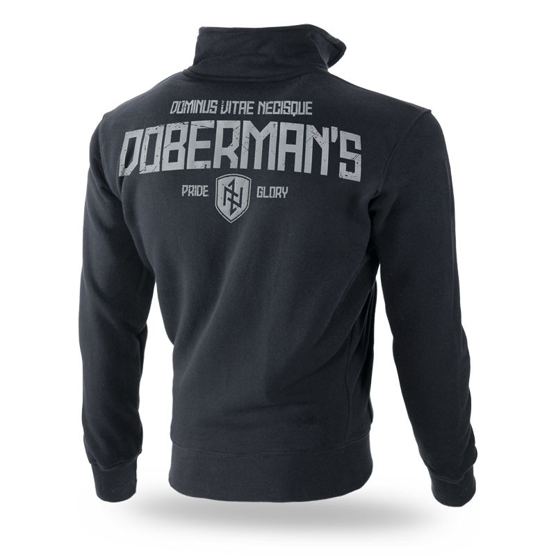 Klassische Sweatjacke aus hochwertiger Baumwolle mit Reißverschluss und Stehkragen, versehen mit elastischen Bündchen und zwei Fronttaschen. Auf der Vorder- und Rückseite befindet sich der Asgaard’s mighty walls. Während die Vorderseite einen kleinen Aufdruck auf der Brust hat, ist auf der Rückseite dagegen ein großer Dominus Vitae Necisque DOBERMANN-Aufdruck komplett mit einem Schild mit Runen und der Verbindung Pride - Glory.