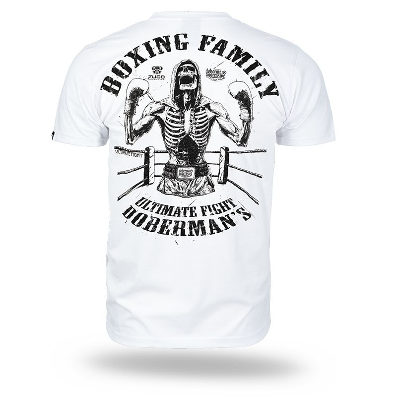 Das T-Shirt besteht aus Baumwolle mit einem Gewicht von 200 g. Auf der Rückseite befindet sich ein Druck Boxing Family.