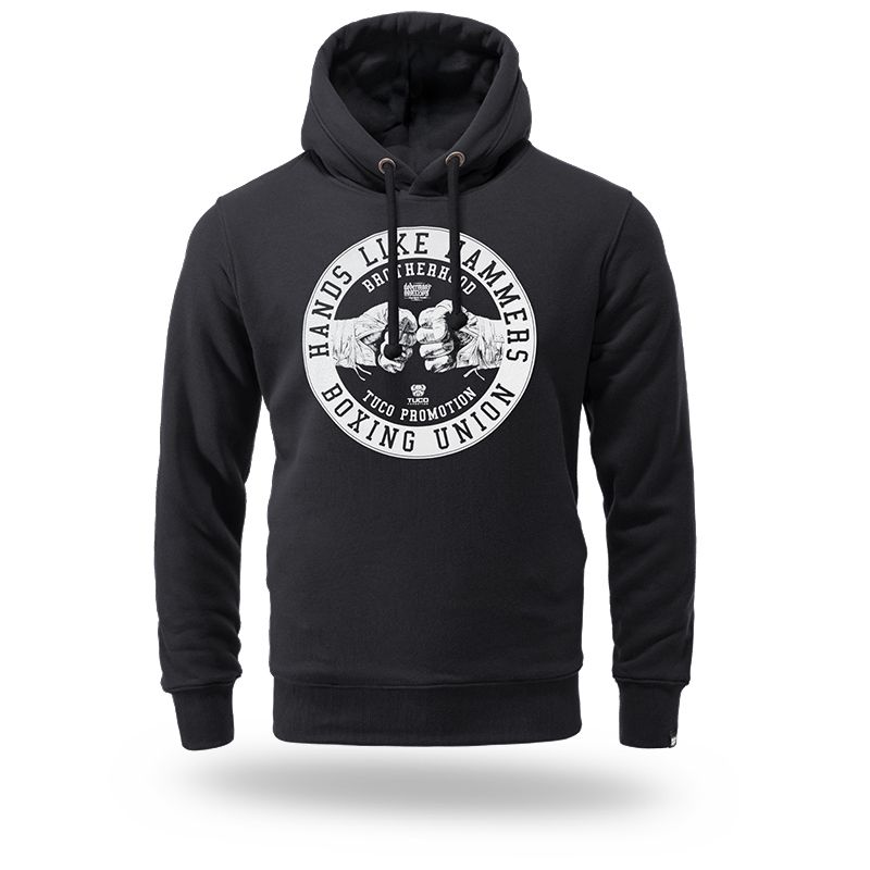 Ein Hoodie von Dobermans Aggressive aus angenehmer Baumwolle mit breitem elastischem Bund an den Ärmeln und am Saum. Auf der Brust mit großer Aufschrift Hands like hammer, boxing union.