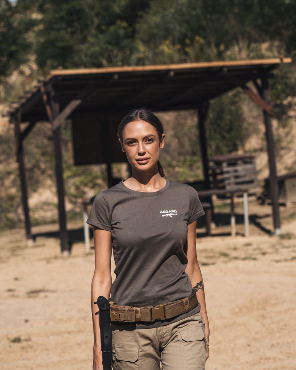 Damenshirt in körpernaher Passform. Auf dem linken Ärmel befindet sich ein kleiner Patch mit dem Doberman´s Aggressive-Logo. Auf der Rückseite befindet sich ein Druck „Asgard Defense Legion”.