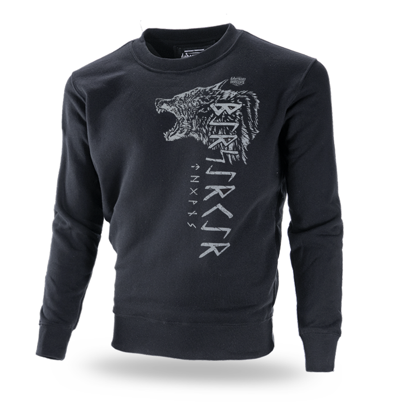 Sweatshirt aus 100 % Baumwolle. Der Saum und die Ärmel sind mit breitem elastischem Bund versehen. Am linken Ärmel befindet sich ein kleines Dobermans Aggressive Logo. Auf der Vorderseite befindet sich ein Muster, das den Kopf eines Wolfs mit geöffnetem Maul zeigt. Vervollständigt wird das Ganze durch den Schriftzug BERSERKER und ein kleines Markenlogo.