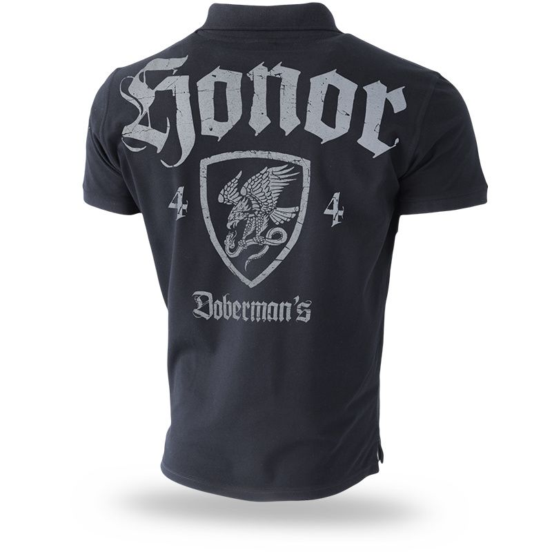 Herren-Poloshirt aus hochwertiger Baumwolle mit kurzen Ärmeln. Auf dem linken Ärmel befindet sich ein kleiner Patch mit dem Doberman´s Aggressive-Logo. Auf der Rückseite befindet sich ein 3D-Druck HONOR Dobermanns, mit dem Schild, der einen Adler zeigt, der mit seinen Krallen die Schlange fängt. Vorne links auf der Brust befindet sich eine gestickte Miniatur, das Symbol dieses Schildes.