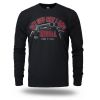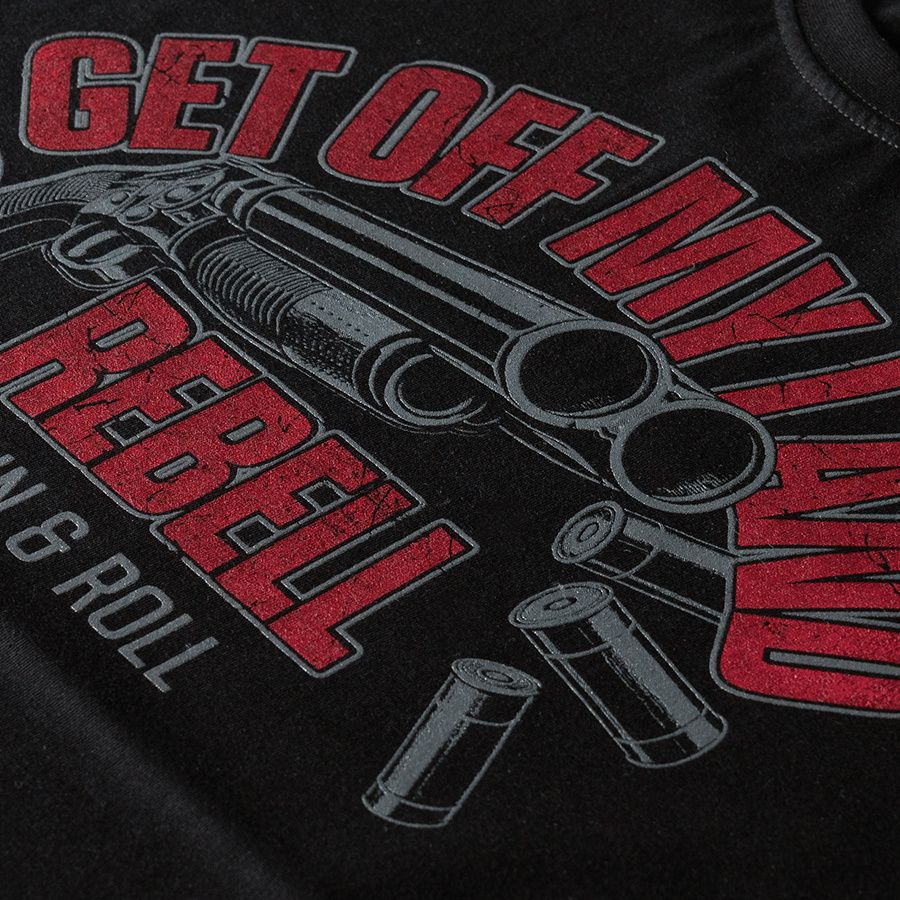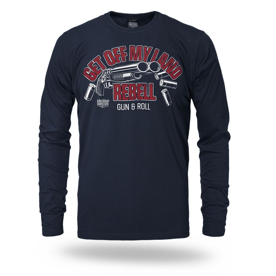Langarmshirt aus angenehmer Baumwolle. Mit schmalem elastischem Bund am Hals. Auf der Brust mit großer Aufschrift Get Off My Land REBELL Gun & Roll.
