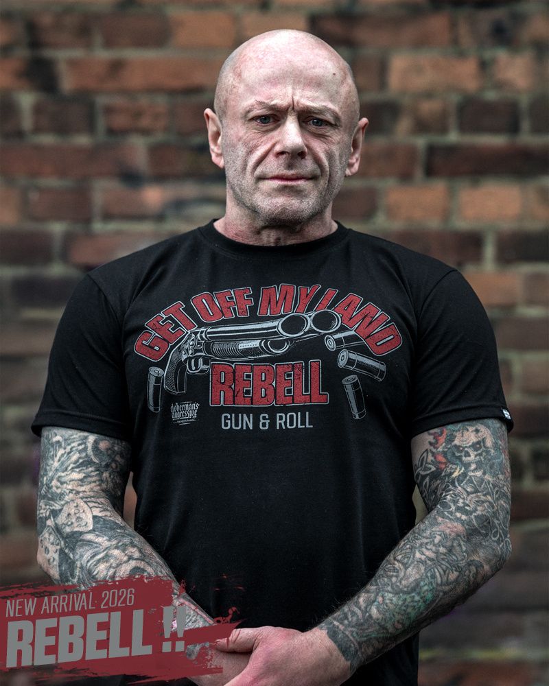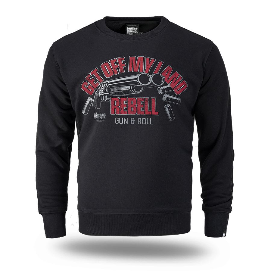 Ein bequemes Sweatshirt aus angenehmer Baumwolle. Auf der Brust mit großer Aufschrift Get Off My Land REBELL Gun & Roll.