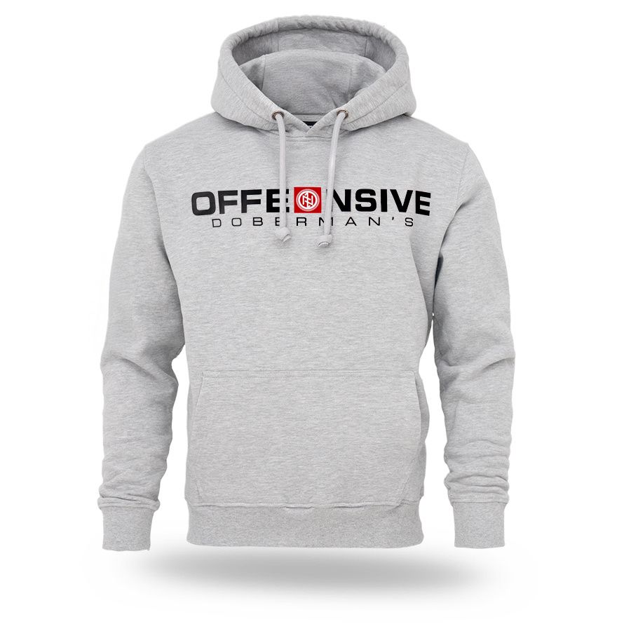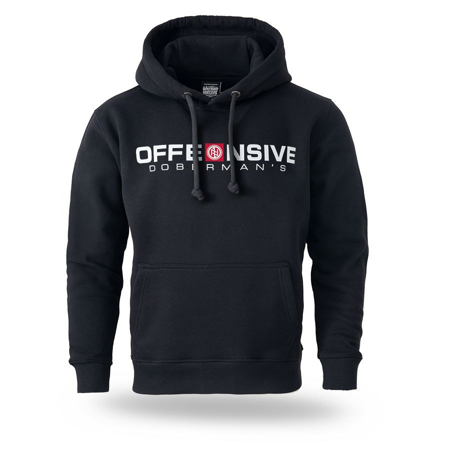 Ein Hoodie von Dobermans Aggressive aus angenehmer Baumwolle mit breitem elastischem Bund an den Ärmeln und am Saum. Auf der Brust mit großer Aufschrift Offensive Doberman´s.