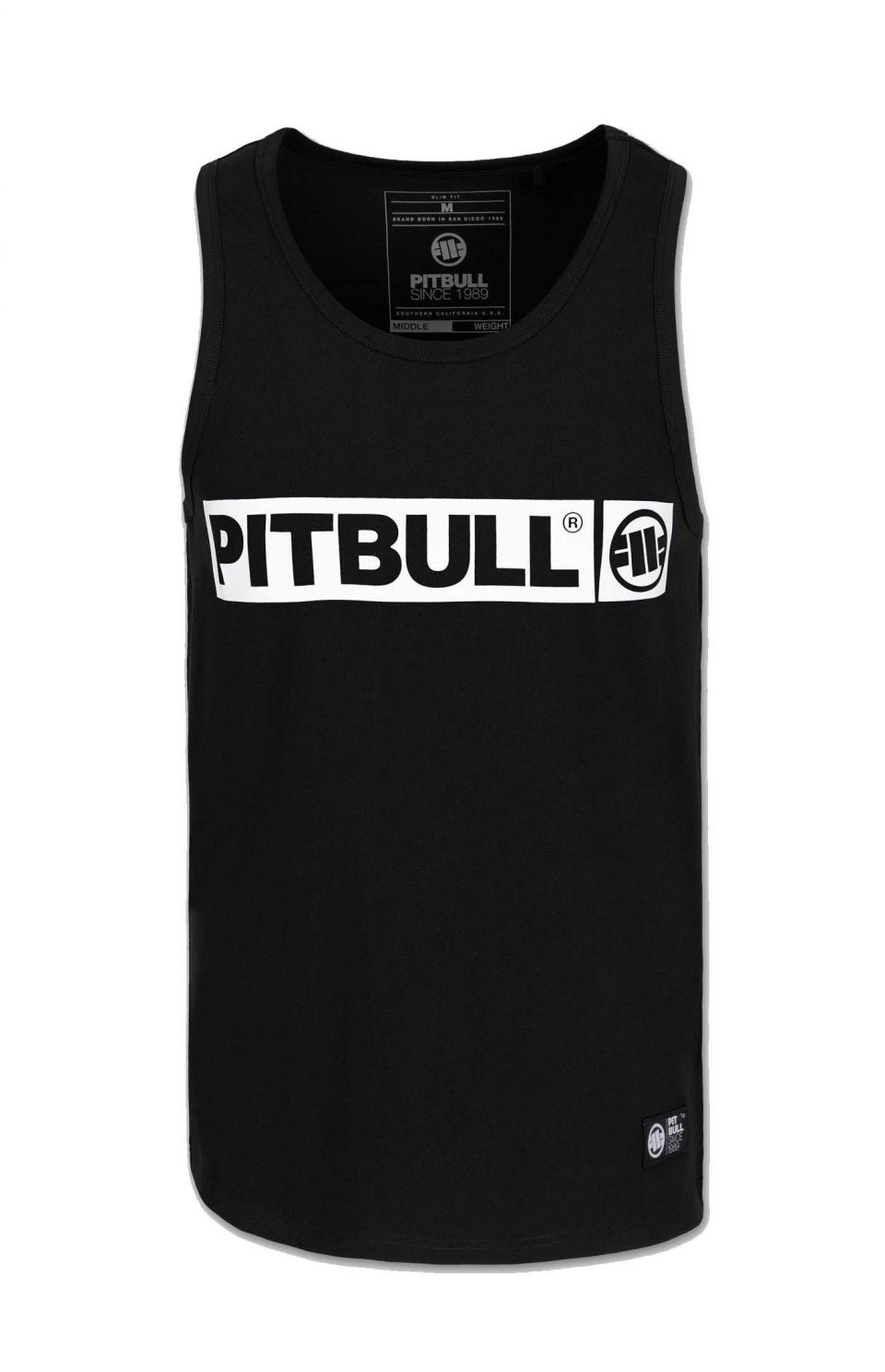 - großer gewebter Aufnäher mit PIT BULL WEST COAST Markenlogo am unteren Rand des Shirts
