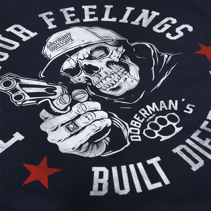 Klassisches Herren-T-Shirt aus hochwertiger Baumwolle mit kurzen Ärmeln.Auf dem linken Ärmel befindet sich ein kleiner Patch mit dem Doberman´s Aggressive-Logo. Auf der Brust mit großer Aufschrift F*ck Your Feelings – Built Different.