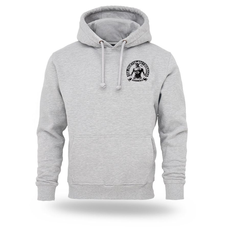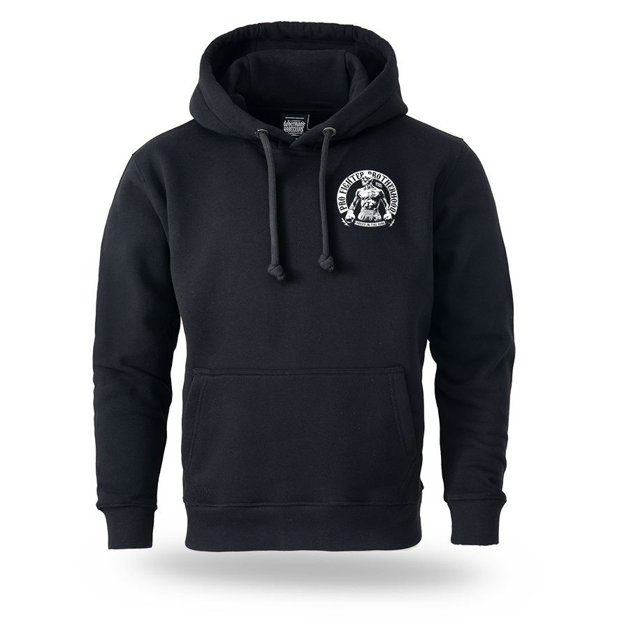 Ein Hoodie von Dobermans Aggressive aus angenehmer Baumwolle mit breitem elastischem Bund an den Ärmeln und am Saum. Vorder- und Rückseite sind mit dem Aufdruck Pro Fighter Brotherhood – Forged in the Ring versehen.