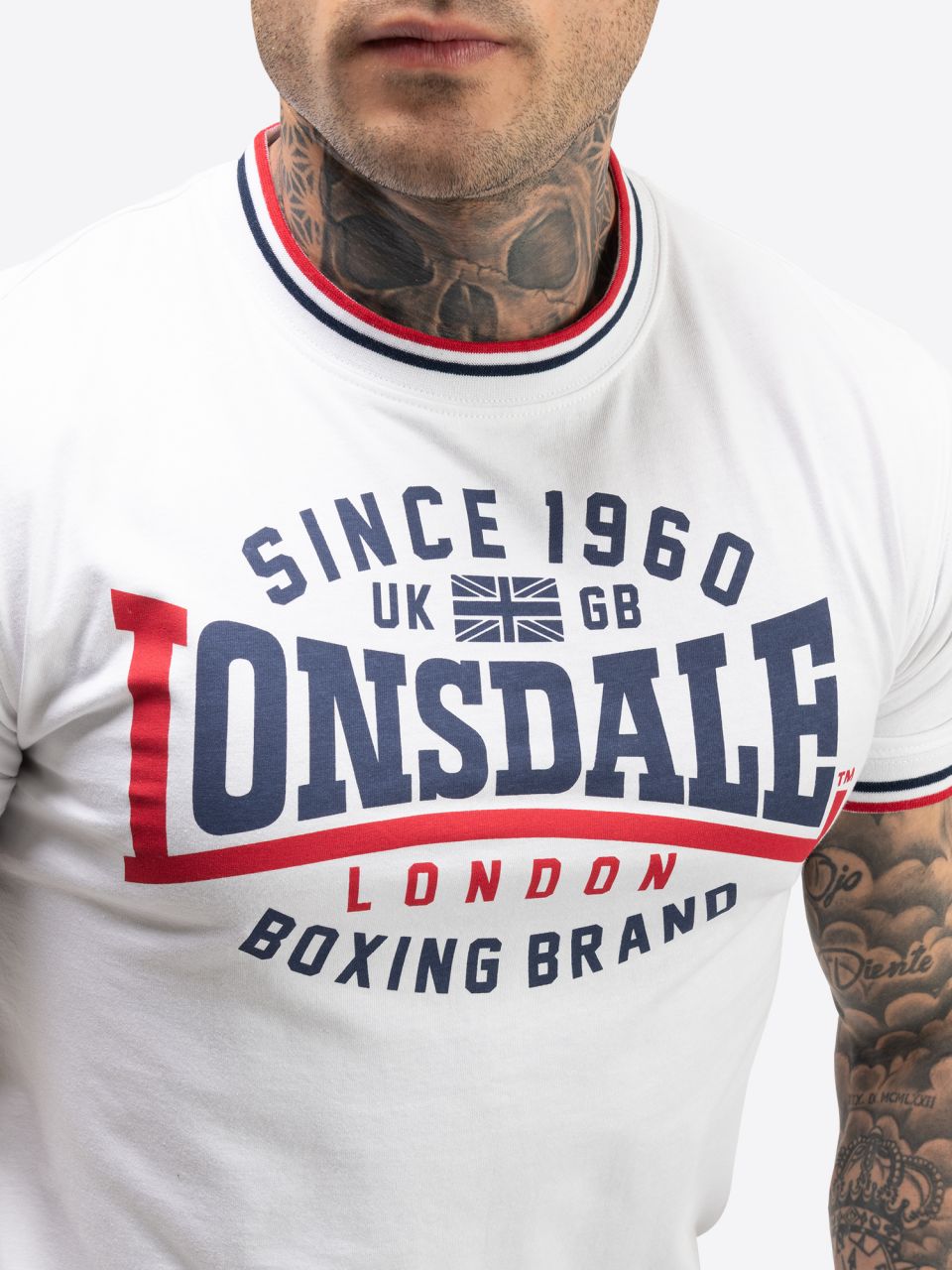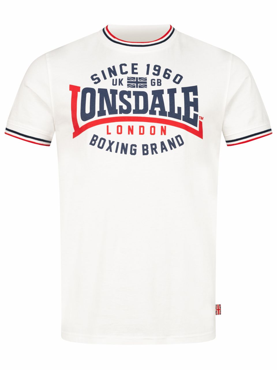- schmal geschnittenes T-Shirt mit kontrastfarbenem Druck auf der Vorderseite. Die Bündchen am Halsausschnitt sowie den Ärmelabschlüssen sind gestreift und nehmen die Farben vom Druck noch einmal auf. An der Seitennaht befindet sich ein gewebtes Label.