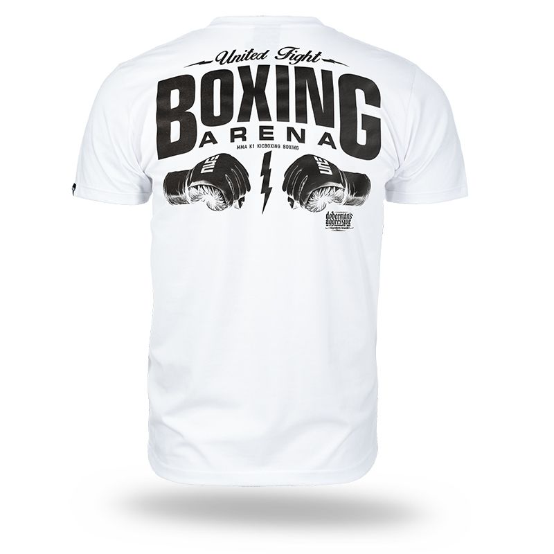 Klassisches Herren-T-Shirt aus hochwertiger Baumwolle mit kurzen Ärmeln.Auf dem linken Ärmel befindet sich ein kleiner Patch mit dem Doberman´s Aggressive-Logo. Vorder- und Rückseite sind mit dem Aufdruck Boxing Arena versehen.